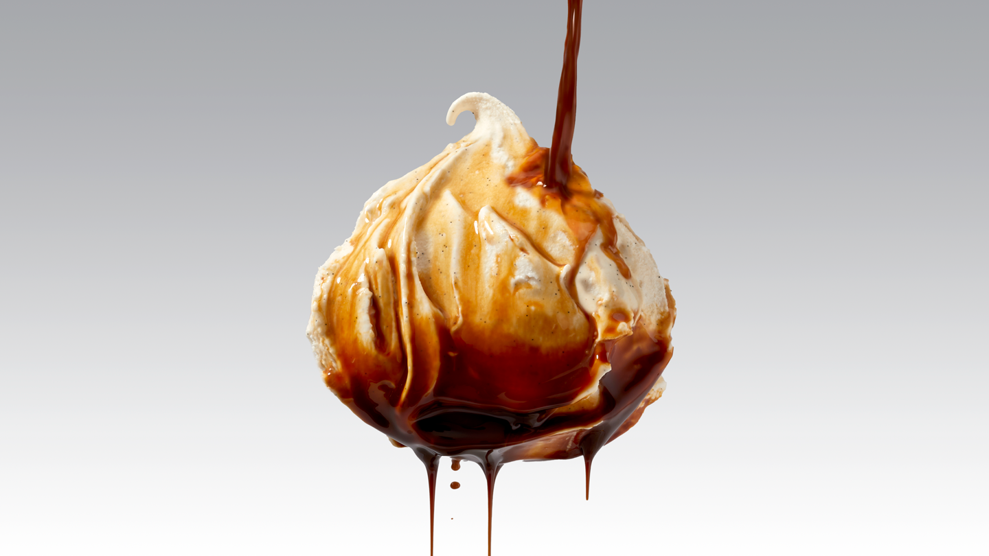 Un fort shot d'espresso chaud versé sur de la glace bien froide dans un verre. A composer avec la glace de votre choix (vanille, fleur de lait ou noisette).