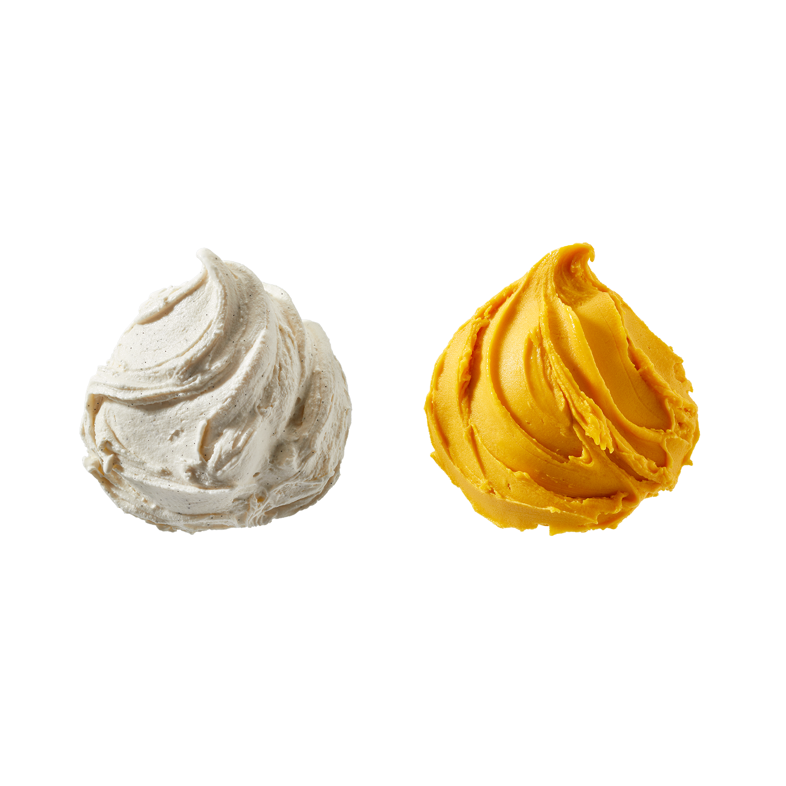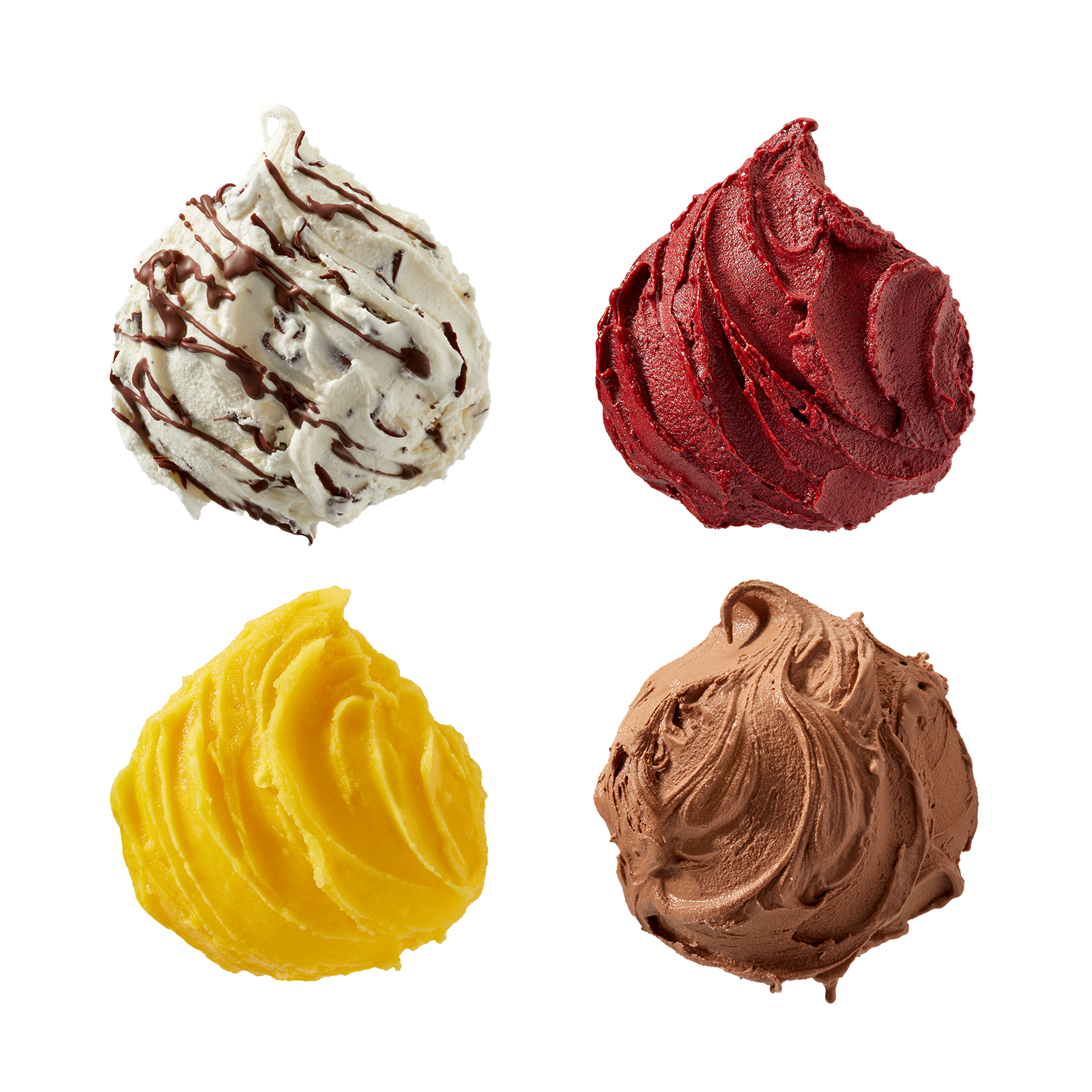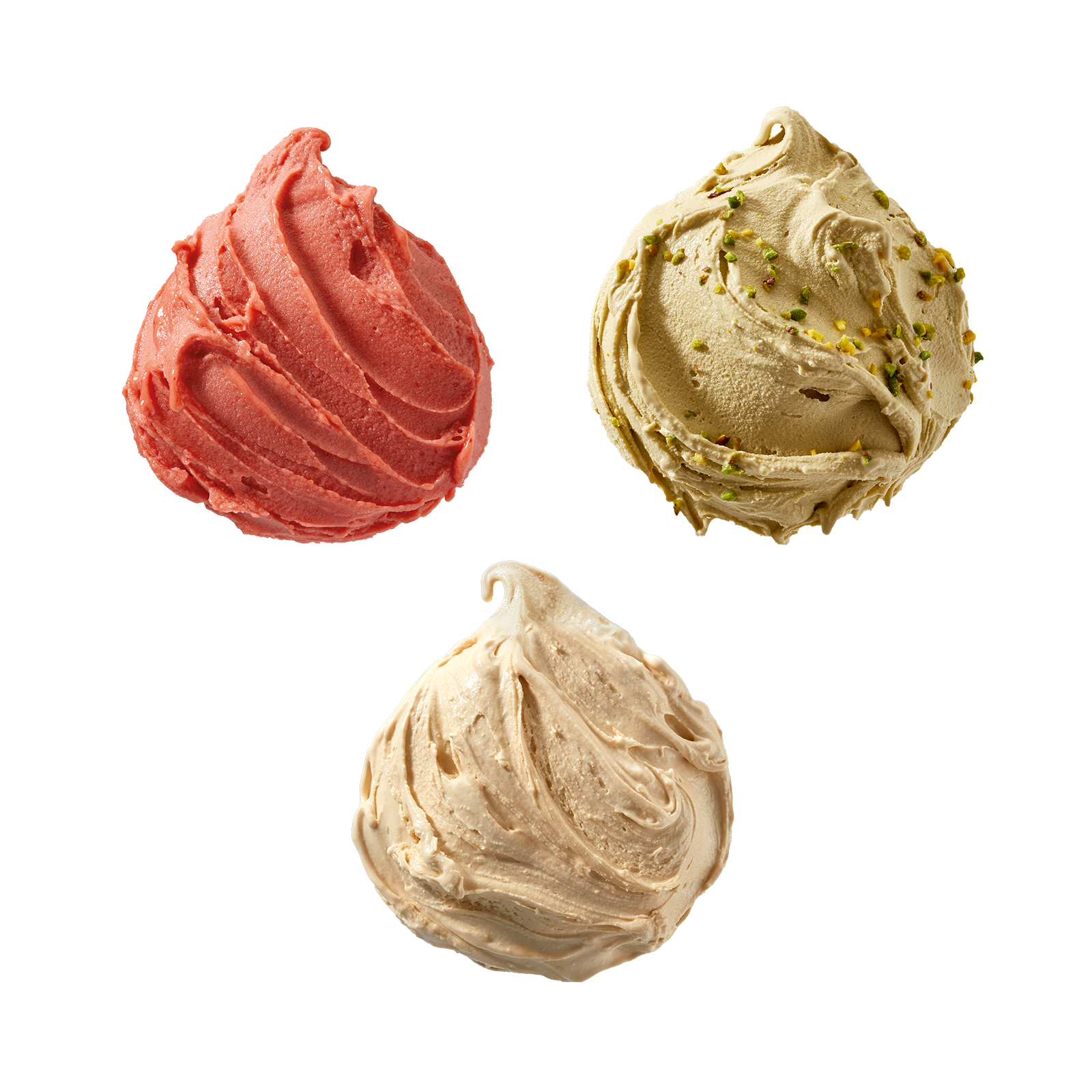 Parfums Vanille, Pistache, Noisette, Citron, Yuzu, Mandarine, Mangue, Cerise, Passion, Yaourt, Chocolat, Amarena, Stracciatella, Café, Fraise, Framboise, Matcha, Cassata Siciliana, Fior di Latte, Caramel, Gianduja, …